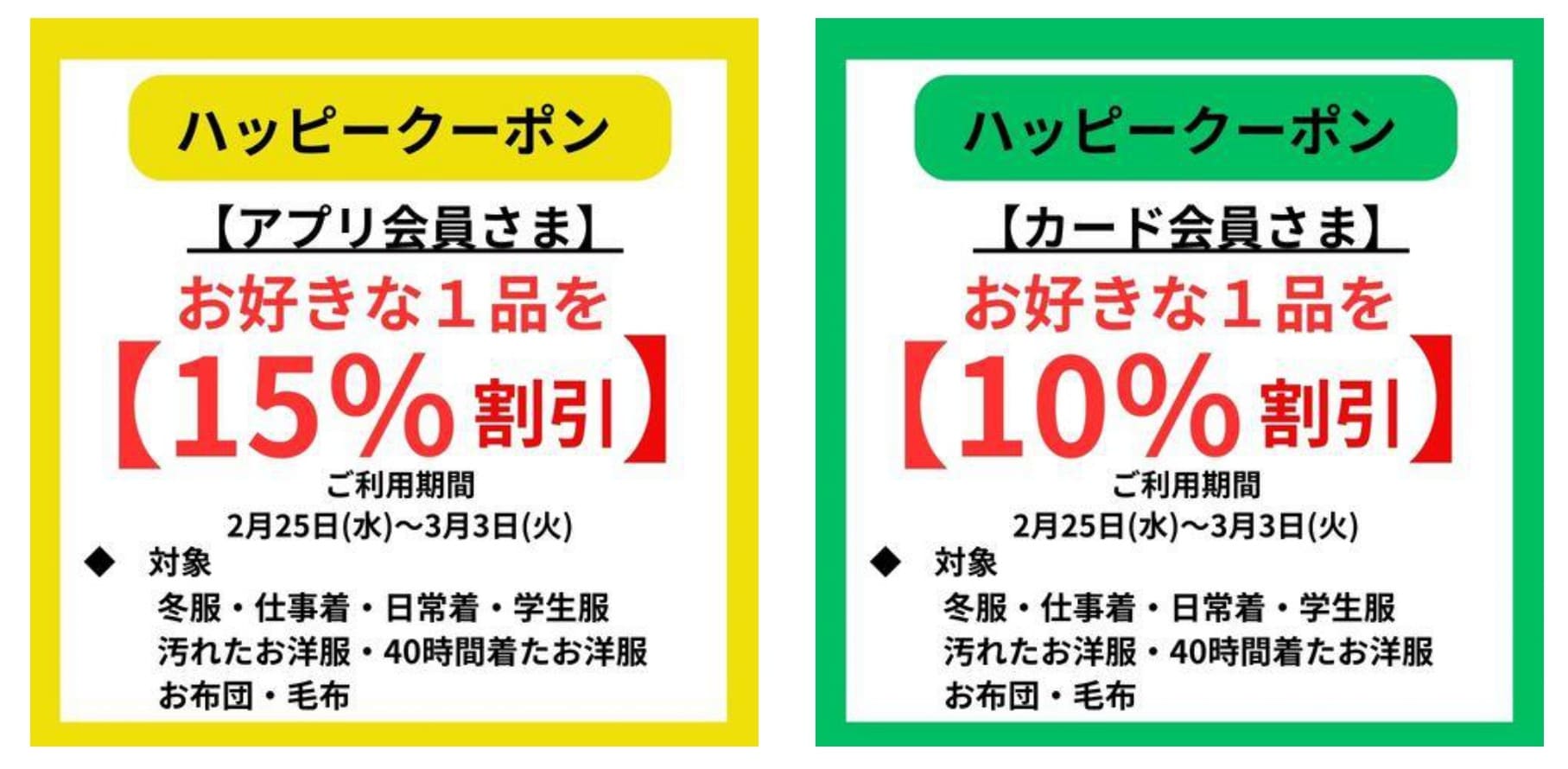 ハッピークーポン (2/25(水)~3/3(火))すべての会員様に ご利用いただけます 2026年2月24日 最終更新日時 : 2026年2月24日 瑜伽 康哲 ハッピークーポン ◎花粉防止加工 40時間着た冬服 仕事着 日常着 ◎汚れ水はじく加工 汚れたお洋服 学生服 ◎(花粉がつかない) お布団 毛布類 適切なお手入れ で 気持ち良く 長く使えます! 笑顔と笑声で お迎えします クリーニングの 日立白洋舎 ーーーーーーー 【事前ご案内】 3月も ◎3点以上で割引 ハッピーセール ◎1品割引 ハッピークーポン 同時開催! ★クローゼットに どうしようかなぁ? と思うお洋服 いつでも お持ちください。 ★これ洗える? ご相談も大歓迎 ーーーーーーー